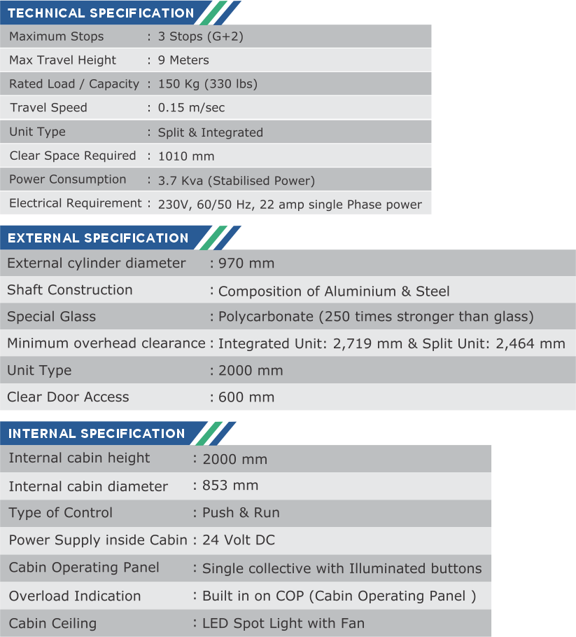 Vacuum Lifts make a statement for themselves. It has the ability to completely transform the look of any surrounding where it is placed. These elevators emit the aura of utmost beauty and richness. Any surrounding that can be imagined, be it a villa, a showroom, a mall or even a 5-star hotel, can have their appearance completely changed as a result of this lift.These give you a panoramic view of the place which acts like a saviour for many people that suffer from claustrophobia as the person doesn’t feel restricted or stuck. The best thing about Vacuum Elevators is its identity of a Green Lift. It consumes minimal power while going up, and NO power during descent, making it a highly valuable investment.